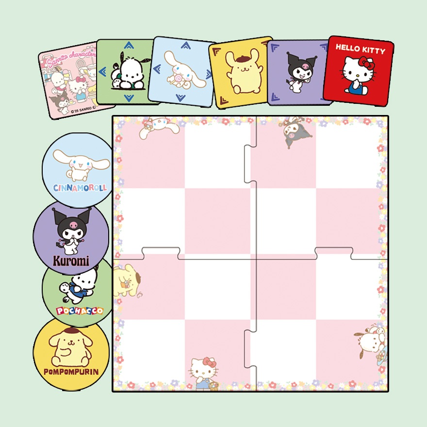 廣受歡迎的卡通人物齊聚一堂,進行考驗記性和運氣的地盤爭奪戰!出牌放入遊戲板,將箭頭所指的牌翻面,試著讓您的人物露臉,越多越好!Hello Kitty 是王牌,可以幫您移除對手的人物。遊戲結束,遊戲板有最多人物露臉的玩家獲勝。