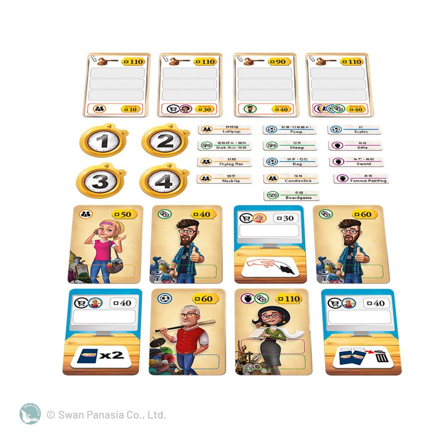 #桌遊 牌套尺寸:6*9.2 cm ( 100 張) 歡迎加入二手拍賣王的行列!進入雜亂的地方,尋找隱藏的物品及遺失的寶藏。遊戲中,你必須搶先在對手之前,從房舍找到能讓你獲利的物品。注意!對手可能會關上燈,或讓所有物品上下倒置,讓他可以捷足先登! 記住,迅速挖寶,正確拍賣,光榮獲勝!