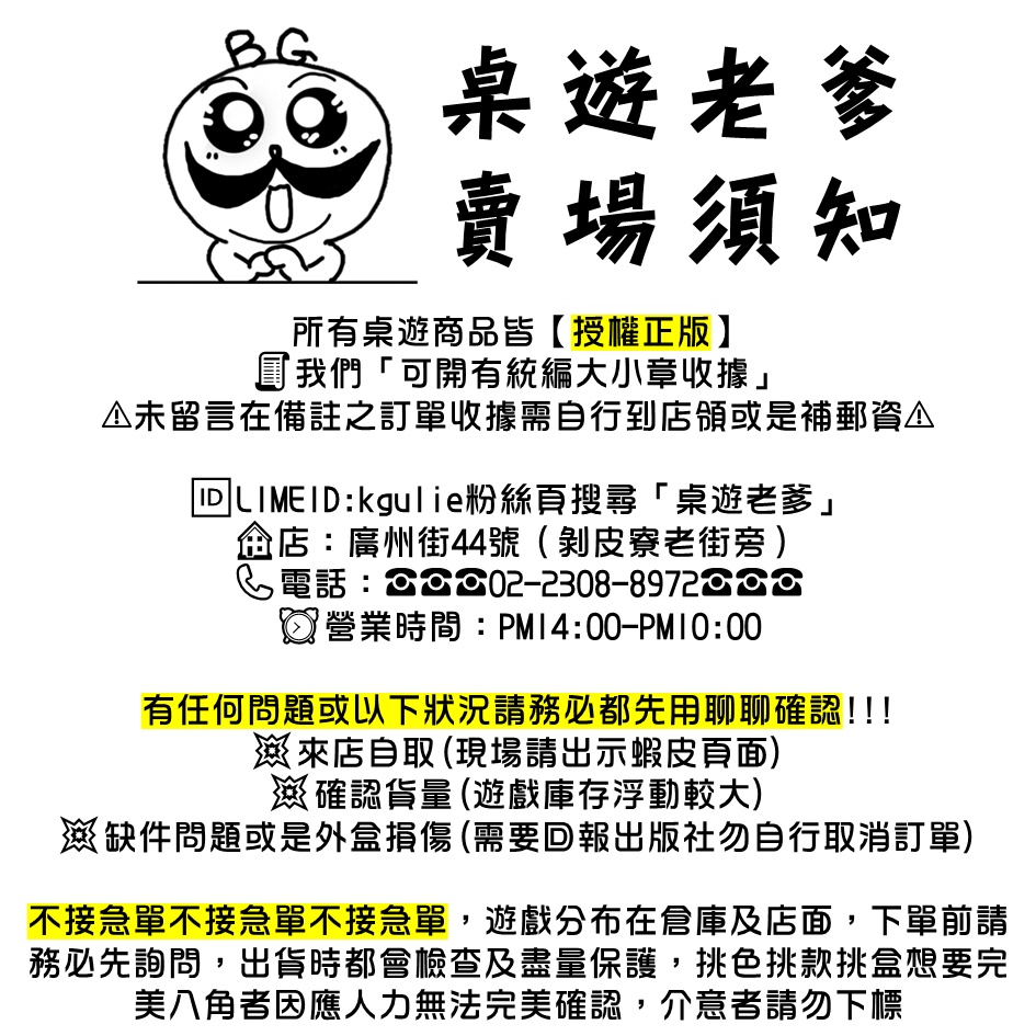 ✅所有桌遊商品皆為授權正版,由出版社全新直寄給老爹,有缺件問題需詢問出版社,部分外盒較軟或是配件微小刮痕為原廠狀況,可先聊聊確認請勿直接取消訂單