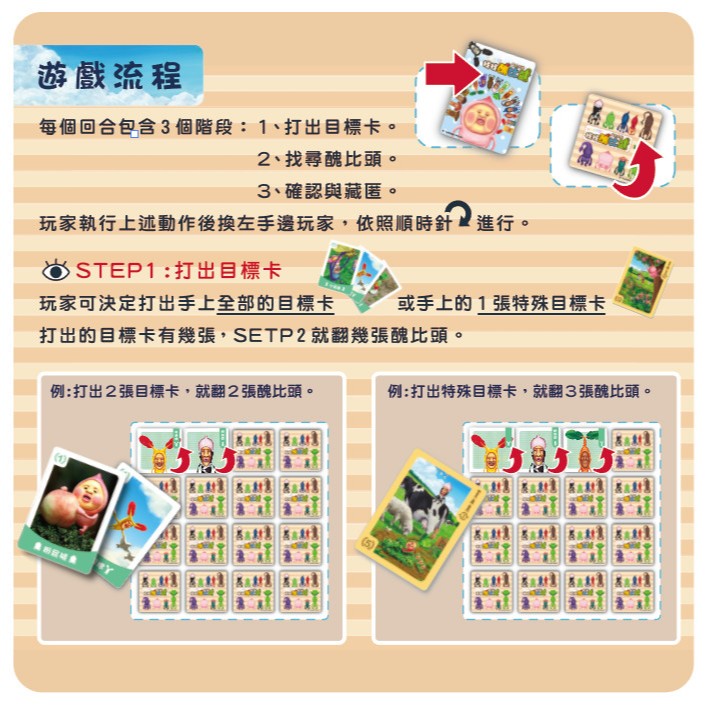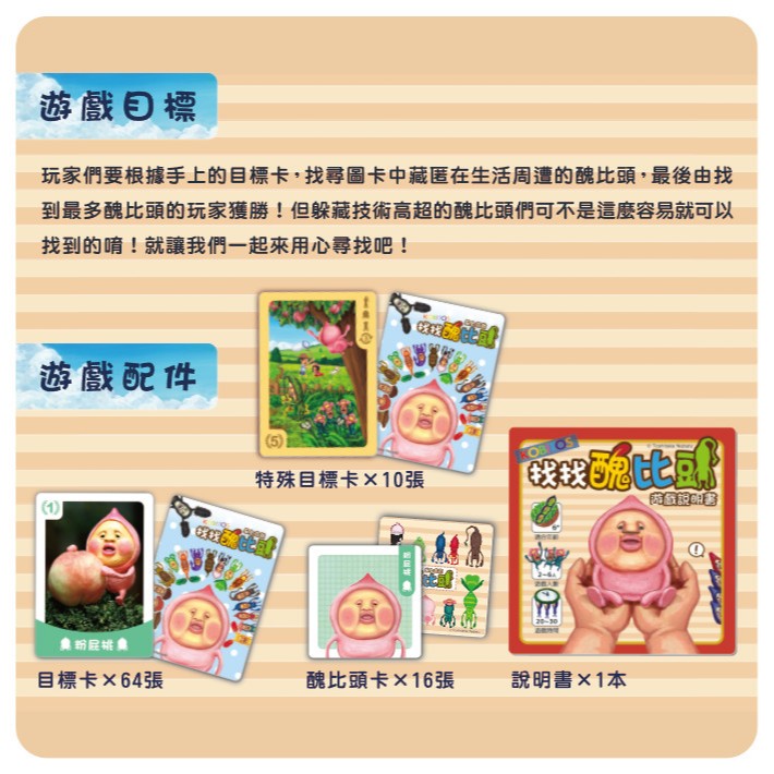 遊戲內容物: 醜比頭卡16張 目標卡64張 特殊目標卡16張 中文說明書1本